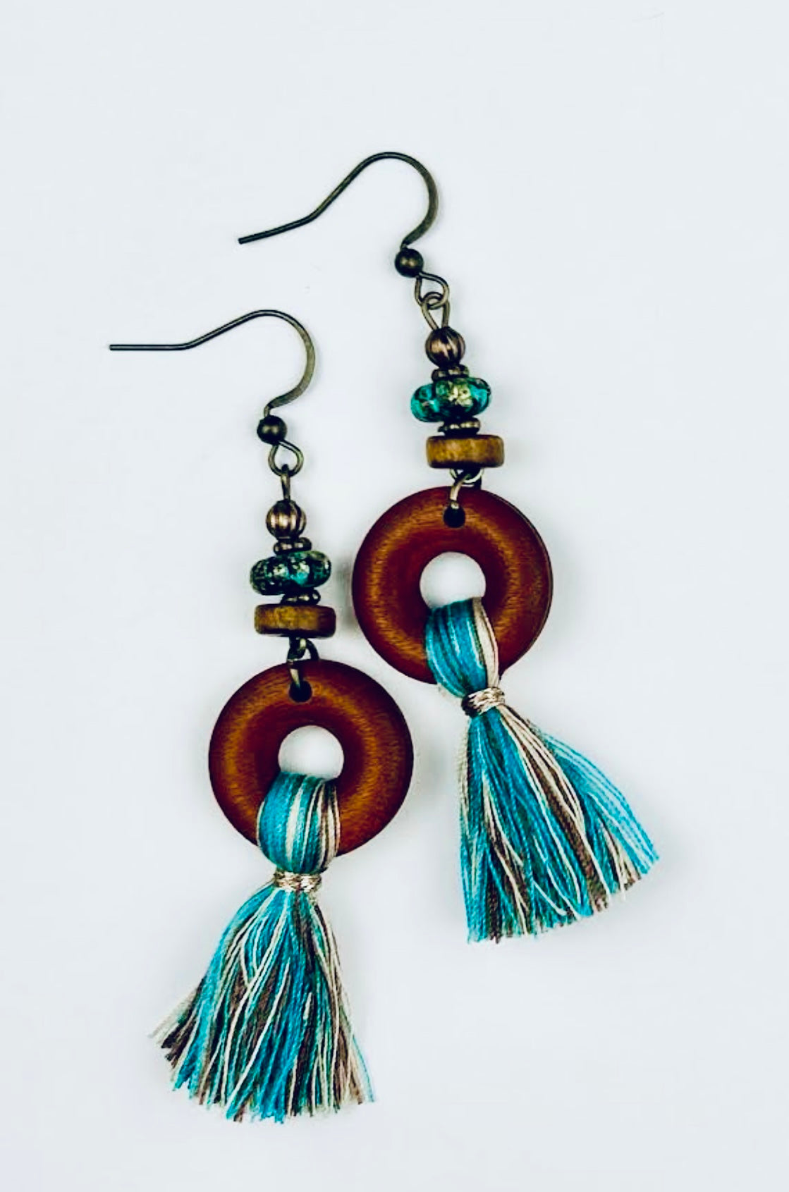 Indulge in these one-of-a-kind earrings engineered to spark conversations. Boasting an ocean-blue glass composition, wood, and tassels, you'll boldly stand out!